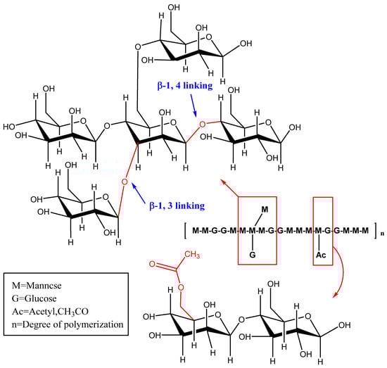 The chemical structure of polysaccharides has a strong influence on their functional and nutritional properties or biological activity [31]. The basic framework of KGM is composed of D-glucose residues and D-mannose residues (molar ratio 1:1.6~1.7) and is polymerized by β-1,4-pyranoside bonds [32]. Part of the side chain can be formed at the C-3 position of the main chain mannose or the C-6 position of the sugar unit, by the linkage between acetyl groups (Figure 3) [33]. KGM has two native conformations, alpha (amorphous) and beta (crystalline) [34]. The molecular weight distribution of KGM is approximately normal since it is a relatively homogeneous polysaccharide. However, KGM has different molecular weight distributions that are affected by their origin, processing, and storage times [24]. It is reported that KGM has a mean molecular weight of 5.83 × 105 g/mol [35].