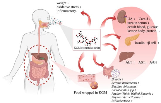 The increase in circulating blood glucose concentration plays a key role in the pathogenesis of chronic diabetic complications [67,68]. The combination of high sugar and high fat will often lead to a series of human health problems, including eye, kidney, heart, liver, nerve, and other dysfunctions. One element influencing the onset and progression of diabetic nephropathy is a long-term aberrant rise in glomerular microcirculatory filtration pressure. Animal experiments have shown that KGM can treat diabetic nephropathy, normalize rat glomerular structure, lower serum uric acid, creatinine-J, urine occult blood, blood glucose, a ketone body, and protein levels [69]. The ability of the liver to store glycogen is an important indicator of T2DM. KGM can promote the synthesis of glycogen in the liver, reducing blood sugar and alleviating the progression of diabetes, which is beneficial to the protection of the liver. Elevated serum alanine aminotransferase (ALT) and aspartate aminotransferase (AST) reflect the degree of hepatocellular damage, and serum alkaline phosphatase (ALP) activity represents the severity of cholestasis [70]. An elevated ALT level is closely related to T2DM, causing abnormal metabolism of leucine, lysine, and glutamic acid. A study was conducted on mice with liver injury prepared by subcutaneous injection of CCl4 as a model [71], it was proved that the administration of KGM could down-regulate the abnormal increase of ALT and AST in mice serum, up-regulate the A/G ratio in serum, and increase the abnormally low superoxide dismutase (SOD) content and decrease the abnormally high malondialdehyde content in the liver homogenate of mice caused by liver injury. This demonstrates the protective effect of KGM on experimental liver injury caused by CCl4 in mice.