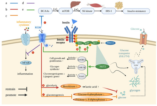 The related mechanism of maintaining sugar homeostasis by KGM. (a) KGM reduces insulin resistance through the BCAA pathway. (b) KGM increases hexokinase activity and glycolysis. (c) KGM regulates the activity of fructose-1 and glucose-6-bisphosphatase and reduces gluconeogenesis. (d) KGM inhibits the signal pathway of related inflammatory factors and reduces the immune inflammatory response associated with diabetes. (e) KGM up-regulates the expression of IRS1 and PI3K to improve the insulin signaling pathway.