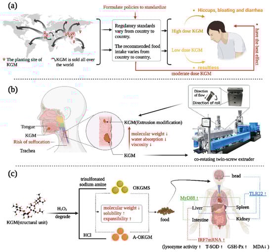Some solutions to KGM’s problems. (a) The establishment of a unified regulatory system can better regulate the average daily intake of KGM and reduce the side effects. (b) KGM that has undergone physical modification can lessen the asphyxia risk. (c) Chemically altered KGM derivatives can improve the body’s immunological indicators.