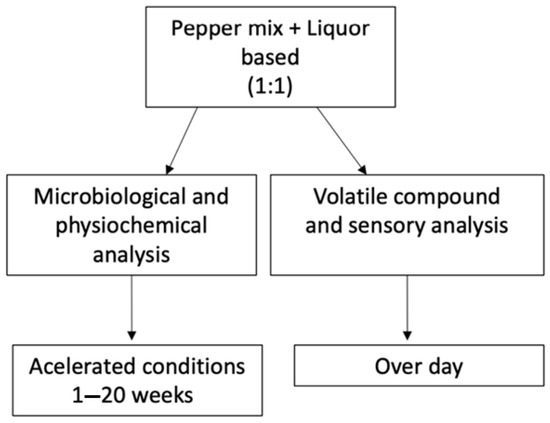 The pepper mix and liquor-based hot sauces produced with tequila, rum, vodka, bourbon, and vinegar (control) were produced and supplied by Swamp Dragon (Swamp Dragon., Baton Rouge, LA, USA). Figure 1 shows the process flow diagram. The hot sauce ingredients included aged peppers (Magic Plant Farms, Johnson City, TN, USA), liquor (Ultrapure, Dallas, TX, USA), salt (Morton, Chicago, IL, USA), and xanthan gum (Kelko, Sandusky, OH, USA). The specific pepper blend is proprietary information and is not shown. Each liquor-based hot sauce formulation was produced with similar proportions of the respective liquor or vinegar (a 1:1 ratio to aged pepper puree in each case) by Swamp Dragon Company. All of the liquors were diluted to 80 proof before mixing with the pepper pure. The microbial analysis, pH, water activity, viscosity, TA, and color were determined weekly from weeks 1 to 20 on accelerated conditions, whereas rheological properties were performed on weeks 1 and 20. Volatile compound and sensory analysis were performed after day 1 of storage. Three replications were performed for physicochemical analysis, microbial analysis, and volatile analysis. All of the experiments were performed in triplicate.