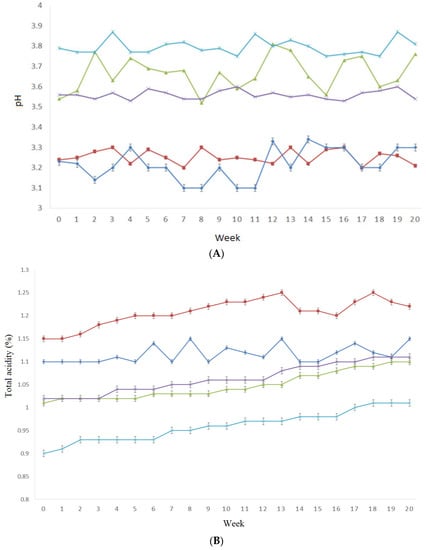 pH (A) and titratable acidity (B) of hot sauces prepared with tequila (dark blue line), bourbon (green line), vodka (purple line), rum (light blue line), and control (brown line) during 20 weeks of storage under accelerated conditions.