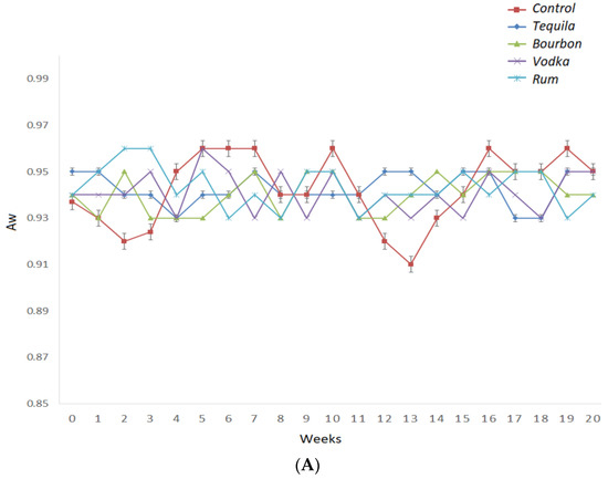 The water activity (Aw) consistently comes into play as it affects the microbiological stability of food matrices [27]. The water activity values were stable during the 20 weeks of storage under accelerated conditions, and the type of liquor did not impact the water activity values. All of the samples had water activity between 0.91–0.96, with a percentage error of 5% (Figure 3).