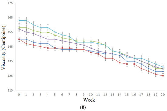 The stress sweep results indicated that the hot sauce with vinegar had the lowest yield stress (τc) values (Table 2) for weeks 0 and 20, and the τc value decreased over time for all samples. In other words, these results showed that the control samples needed the lowest stress to generate structure deformation and had the lowest stability. On the other hand, hot sauces made with rum had the highest τc values, and they needed higher stress to distort their initial structure. This phenomenon can be associated with the favorable deformation of xanthan gum in hot sauce at lower pH, leading to a weaker structure [34]. In addition, ethanol inclusion at 30% in XG/water media did not affect viscosity parameters [31] and possibly did not affect XG gel formation properties in the hot sauce matrix. XG increases electrostatic, H-bonding, and hydrophobic interactions [35], and the lower n’ and n’’ values in the vinegar hot sauce could be due to the destruction by acetic acid of the hydrophobic bonds, in which pyruvate groups are involved.