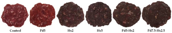 Visual aspect of the beef burgers formulated after the preparation and considering the six treatments: control, Pd5 (5% Pleurotus djamor powder), Hs2 (2% Hibiscus sabdariffa powder), Hs5 (5% Hibiscus sabdariffa powder), Pd5-Hs2 (5% Pleurotus djamor powder with 2% Hibiscus sabdariffa powder), and Pd7.5-Hs2.5 (7.5% Hibiscus sabdariffa powder with 2.5% Hibiscus sabdariffa powder).