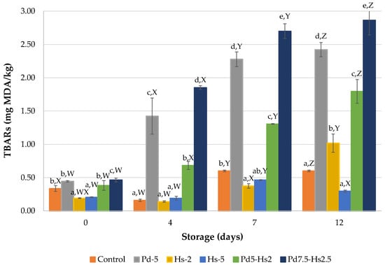 TBARs results (mg MDA/kg) of formulations with Pd and Hs powders. a–e Mean values for each day with different letters differ significantly (p < 0.05). W–Z Mean values for each formulation with different letters differ significantly (p < 0.05).