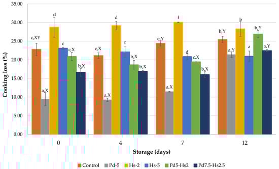 Cooking losses (%) of formulations with Pd and Hs powders. a–f Mean values for each day with different letters differ significantly (p < 0.05). X,Y Mean values for each formulation with different letters differ significantly (p < 0.05).