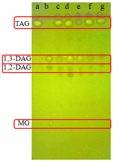TLC bands of (a) TAG standard, (b) DAG standard (containing small amounts of MAG), (c) lipids from MLY23, (d) lipids from MLG23, (e) lipids from MLGP11, (f) lipids from MLP41, and (g) lipids from MLY31W.