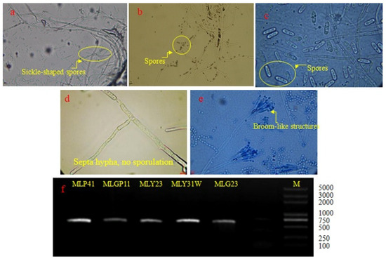 The five selected isolates coded as MLP41, MLG23, MLY23, MLY31W, and MLGP11 were identified based on morphological features and ITS sequences. Their morphological features under a microscope are indicated in Figure 2. The morphological characteristics of the isolate coded as MLP41 showed sickle-shaped or oval spores with a diaphragm (Figure 2a). The conidia of MLG23 performed in solitary or clustered spores, and the hyphae were slender and septate (Figure 2b). The conidia of MLY23 exhibited short sticks and almost uniform size (Figure 2c). For MLY31W, its mycelium had a septum, and no spores were produced (Figure 2d). The morphological characteristics of MLGP11 included broom-like structures (Figure 2e). The morphological characteristics of MLP41, MLG23, MLY23, MLY31W, and MLGP11 under a microscope were consistent with those of the corresponding genera Fusarium sp., Trichoderma sp., Colletotrichum sp., Pestalotiopsis sp., and Penicillium sp., respectively.