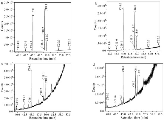 Typical GC-MS ion chromatogram of lipids from the endophytic fungus MLY23 and its DAG and TAG components: (a) Lipids before TLC separation, (b) TAG, (c) 1,2-DAG, (d) 1,3-DAG.
