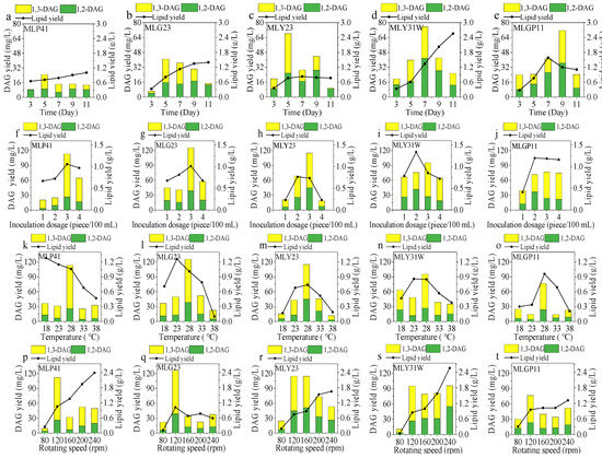 Temperature plays a very critical role in microbial growth and lipid accumulation. Here, the five screened isolates were cultured at 18, 23, 28, 33, and 38 °C for their corresponding optimized fermentation time with an inoculation dosage of 3 pieces/100 mL of medium at the rotating speed 120 rpm/min of flasks, and the yields of lipids and DAG are given in Figure 4k–o. The speed of lipid accumulation varied at different temperatures. The effect of temperature on the lipid accumulation rate of the MLP41 strain was different from that of the other four strains. As the temperature increased from 18 to 38 °C, the lipid yield of MLP41 decreased from 1.28 to 0.47 g/L (Figure 4k). However, the total DAG yield of MLP41 reached the maximum value of 113.19 mg/L at 28 °C (Figure 4k). For the MLG23 strain, its lipid yield showed the maximum value at 23 °C, but the maximum total DAG yield of 125.63 mg/L with a lipid yield of 1.01 g/L was obtained at 28 °C (Figure 4l). The yields of DAG from MLP41 and MLG23 reached their maximum values at different temperatures, indicating that their DAG accumulation occurred at different optimum temperatures. This may be due to differences in the optimal temperature of enzymes required for growth of microbial cell and production of secondary metabolites. The isolates coded as MLY23, MLY31W, and MLGP11 obtained the maximum lipid yield and DAG yield at 28 °C, and the maximum total DAG yields were 114.99, 95.36, and 76.64 mg/L, respectively.