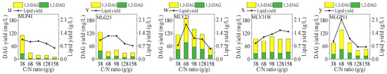 An important biochemical regulatory mechanism of lipid accumulation is nitrogen limitation [33]. When oleaginous microorganisms grow under nitrogen-deficient conditions (high C/N ratio), the excess carbon source will stimulate the synthesis of FAs through the de novo FA synthesis pathway and store them in the cells in the form of lipid droplets. The yields of lipids and DAG in the five strains cultured at different C/N ratios in medium are shown in Figure 4u–y. The other culture conditions were an inoculation dosage of 3 pieces/100 mL and a flask rotating speed of 120 rpm/min at 28 °C for the optimal time. It is obvious that the C/N ratio greatly affected the yields of lipids and DAG. For the fungal strains MLP41 and MLG23, the highest total DAG yields of 112.28 and 126.42 mg/L were obtained with a C/N ratio of 38 (g/g), and further increasing the C/N ratio had no significant effect on improving the yield of DAG. The change in the C/N ratio had little effect on the DAG yield of MLY31W, and the highest total DAG yield was only 105.61 mg/mL at a C/N ratio of 98 (g/g). The total DAG yields of MLY23 and MLGP11 reached the highest values of 189.87 and 135.56 mg/L at the C/N ratio of 68 (g/g). MLY23 obtained the highest total DAG yield among the five endophytic fungi, reaching 189.87 mg/L with 1,2-DAG of 77.55 mg/mL and 1,3-DAG of 112.32 mg/mL. The results suggested that the appropriate C/N ratio would be helpful for DAG production in some fungal strains.
