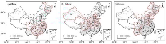 Main crop-producing provinces for (a) rice, (b) wheat, and (c) maize, respectively. The grey-shaded areas indicate the harvested areas. The provinces surrounded by red lines represent the top 10 producing provinces. The full names of the abbreviations for each province can be found in Table 1.