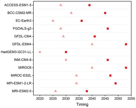 Timing to reach 1.5 °C (pink triangles) and 2 °C (red squares) global warming targets under SSP5-8.5. The year denotes the central timing of a 20-year time window.