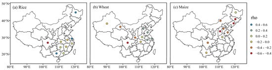 Figure 3 shows the Spearman’s rho between the detrended TGS and yield for each crop and province. For rice, temperature and yield were significantly negatively correlated in Sichuan province (rho = −0.52, p < 0.05), while they were significantly positively correlated in Heilongjiang (rho = 0.51, p < 0.05) and Jiangsu (rho = 0.45, p < 0.05) provinces as well as Guangxi Zhuang Autonomous Region (rho = 0.42, p < 0.05). For wheat, temperature and yield were negatively correlated in the northwestern and southwestern provinces, with the lowest correlation coefficient of −0.55 (p < 0.05) in Sichuan province, while positive correlations were observed in northern China and the Yangtze River Delta provinces. In contrast, for maize, temperature and yield were negatively correlated for all provinces except Heilongjiang and Henan, with the lowest correlation coefficient of −0.48 (p < 0.05) in Liaoning province. The correlations between TGS and yield are consistent with those in previous studies [,,,,,,,]. These results indicated that the dependence between yield and TGS varied with crop and region. Overall, a negative correlation between yield and TGS was observed in about half of the rice- and wheat-producing provinces and in the vast majority of the maize-producing provinces.