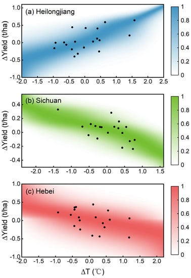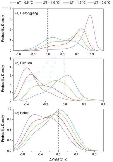 Based on the joint distribution of ∆TGS and ∆Yield, the conditional probabilities of yield variation under different warming conditions (herein ∆TGS = 0.5 °C, 1 °C, 1.5 °C, and 2 °C) were estimated to reveal the sensitivity of yield to warming. As shown in Figure 5a, the conditional probability distribution of ∆Yield for rice in Heilongjiang province became more left-skewed with enhanced warming, indicating that yield was more likely to increase, or in other words, less likely to decrease, with warmer temperatures. By contrast, the conditional probability distribution of ∆Yield for wheat in Sichuan province and maize in Hebei province became more right-skewed as warming intensified (Figure 5b,c), suggesting a greater likelihood of yield reduction with warmer temperatures. These results indicated that the probability distribution of yield had different skewness and kurtosis under different warming conditions and varied with crop and province.