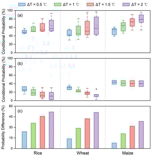 3.2. Conditional Probability of Yield Reduction under Different Warming Conditions