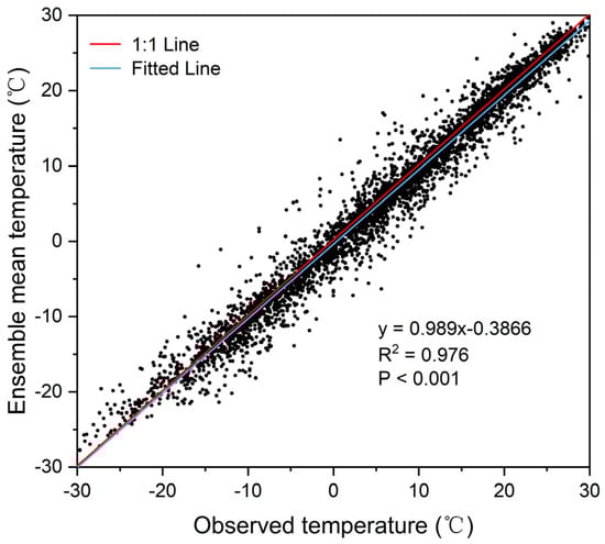 Validation of the ensemble mean temperature of the 12 CMIP6 models against the observed temperature. Each black dot represents a randomly selected grid point within China.