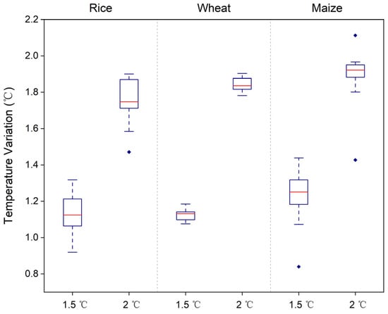 The bias-corrected and downscaled temperature data were validated in the reference period by randomly selecting grid points within China. As shown in Figure 7, the multi-model ensemble mean of temperature presented a good agreement with the observed temperature (R2 = 0.976, p < 0.001), indicating that the corrected simulation data could reproduce the temperature variation and therefore were suitable for future warming prediction. The future TGS variations for each crop and province were then calculated at 1.5 °C and 2 °C global warming under SSP5-8.5 compared to the reference period. Overall, the magnitude of variation in TGS varies with crop and is ranked under both global warming conditions: maize > wheat > rice (Figure 8). Notably, the difference in TGS variation between the 1.5 °C and 2 °C global warming will exceed 0.5 °C, indicating that the increasing gradient in TGS between the two warming conditions is greater than that of GMST.