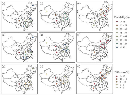 When additional global warming of 0.5 °C occurs (i.e., the 2 °C global warming condition), the probability of yield reduction will increase by 2–17%, 1–16%, and 3–17% for rice, wheat, and maize, respectively, in the vulnerable provinces, while declining to different degrees in the non-vulnerable provinces (Figure 9g–i). This suggests that the additional warming would pose a greater risk of yield reduction in the vulnerable provinces, while mitigating the yield reduction risk in non-vulnerable provinces. For instance, the risk of rice yield reduction will increase by 17% in Sichuan province, while it will decrease by 8% in Heilongjiang province.