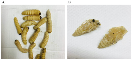 | Pupae | 75.7 a ± 4.6 | 12.1 a ± 0.0 | 11.8 a ± 1.5 | 6.4 a ± 0.4 | 6.3 a ± 0.8 | 6.4 a ± 0.4 | 76.5 a ± 4.8 | 75.3 a ± 0.1 |