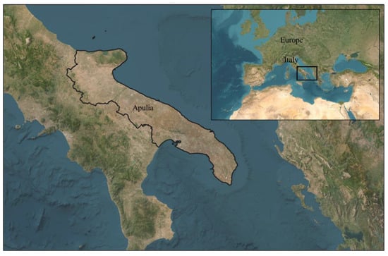 The European geographic location of the study area—Apulia region (southern Italy). Source: our elaboration.