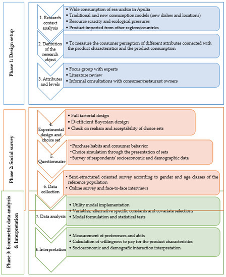 DCE, a well-established method, is widely used to understand consumers’ preferences and to estimate their WTP towards food product characteristics (i.e., attributes) such as food and/or seafood. Based on utility theory, we conducted the DCE in 3 phases which were divided in 8 steps (Figure 3), as follows: Phase 1—design set-up, which included the (i) research context analysis, (ii) definition of the research object, and (iii) selection of the attributes and the assignment of levels. Phase 2—survey, which included the (iv) experimental design and construction of choice sets, (v) realization of the questionnaire, and (vi) data collection. Phase 3—analysis and interpretation of the data, which included the (vii) data analysis using an econometric-based model and the (viii) interpretation of the preferences and the estimation of the WTP for the product characteristics.