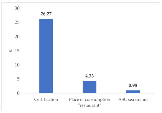 The distribution of WTP for the selected attributed are presented in Figure 4, in which the highest WTP is determined by the “Certification” attribute (average € 26.27/dish), followed by the place of consumption “Restaurant” (average €4.33/dish), and ASC sea urchin (average €0.98/dish). As such, Apulian consumers are willing to pay € 10.53/dish on overall average for sea urchin consumption.