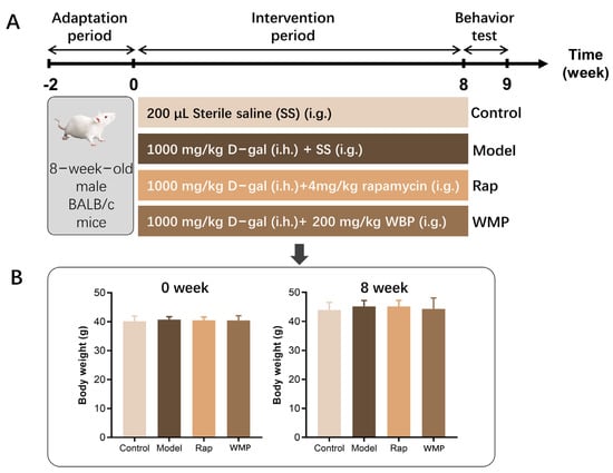 The design scheme of the animal experiment (A) and the effects of WMP on body weights of D-gal-induced aging mice (B). i.g. intragastric; i.h., hypodermic injection.