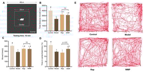 The effects of WMP on locomotor activity and anxiety-like behavior of mice. (A) Schematic representation of the open field test, (B–D) The total distance moved, moved times and the number of times the mice entered the center the open field, respectively, (E) The moving trajectory of mice in each group. * p < 0.05 vs control group and # p < 0.05 vs model group; ns: not significant.
