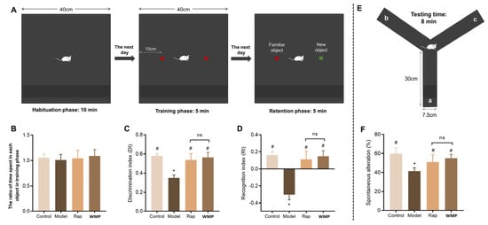 The effects of WMP on short-term spatial and recognition memory of mice. (A) Schematic representation of NORT, (B–D) The ratio of time spent in exploring each object in the training phase, DI and RI, respectively, (E) Schematic representation of the YMT, (F) Spontaneous alteration (%). * p < 0.05 vs control group and # p < 0.05 vs model group; ns: not significant.