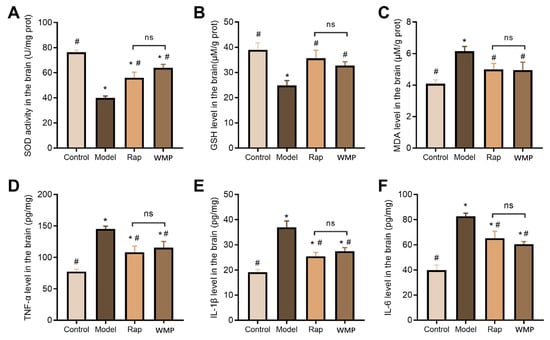 The effects of WMP on the antioxidant index and inflammatory cytokine in the brain. (A–C) SOD activity, GSH and MDA levels, respectively, (D–F) the levels of TNF-α, IL-1β and IL-6, respectively. * p < 0.05 vs control group and # p < 0.05 vs model group; ns: not significant.