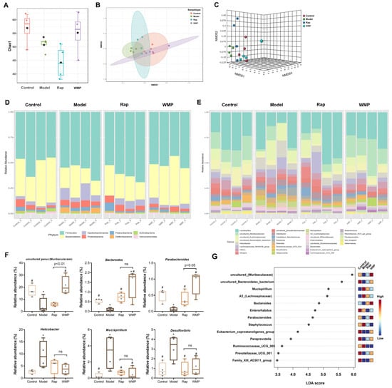 Effects of WMP on the diversity and composition of gut microbiota in mice. (A) Boxplots of the Chao 1 index for the gut microbiota. (B,C) The 2D and 3D plots of the scores of the principal component analyses of the gut microbiota. (D–F) The relative abundance of the gut microbiota at the phylum and genus levels. (G) The significantly changed genus screened by the random forest method. * p < 0.05 vs control group and # p < 0.05 vs model group; ns: not significant.