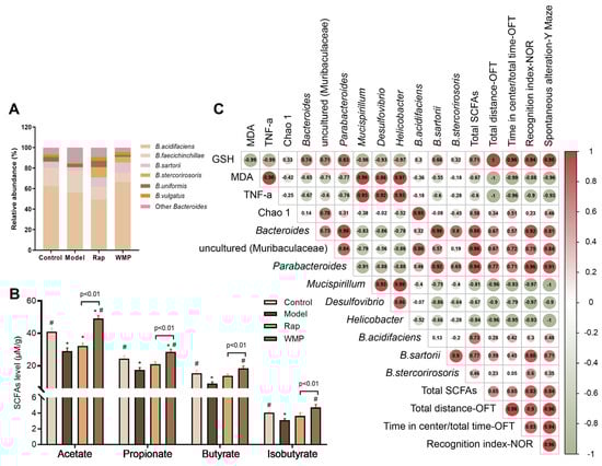 Effects of WMP on the SCFAs level and the Spearman correlation analysis. (A) Effects of WMP on the Bacteroides, (B) The SCFAs levels, and (C) the Spearman correlation analysis. The colors and values indicate the distribution of the Spearman’s correlation coefficients. * p < 0.05 vs control group and # p < 0.05 vs model group.