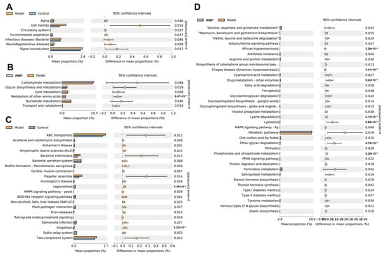 Effects of WMP on the functional profile of the gut microbiota. (A,B) the enriched KEGG pathways at level 2, (C,D) the enriched KEGG pathways at level 3.