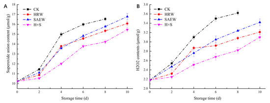 Changes in superoxide anion content (A) and H2O2 content (B) in fresh-cut kiwifruit after different treatments, during storage.