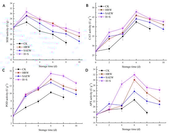 As seen in Figure 2D, the APX activity of fresh-cut kiwifruit first increased internally and then decreased with storage time, reaching a peak value at day 6. During the storage, except for the second day, the APX activity of samples treated with HRW, SAEW, and H+S was significantly higher than that of the CK group sample (p < 0.05). Since then, the APX activity of samples treated with H+S has been at a high level. Until the 6th day of storage, the APX activity of samples treated with HRW, SAEW, and H+S was 1.33 times, 1.17 times, and 1.42 times that of the CK group samples, respectively. The APX activity of fresh-cut kiwifruit treated with H+S was significantly increased (p < 0.05), which is beneficial for maintaining fruit quality.