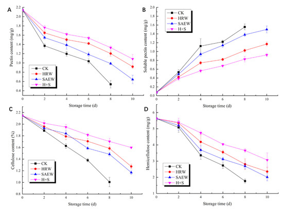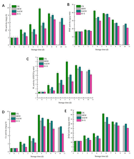 The main reason for the texture-softening of fruit is that the cell wall-degrading enzyme acts on the cell wall, reducing the connectivity degree between cells, and resulting in cell separation [29]. PG and PME are closely related to the decomposition of pectin in the fruit cell wall. The acting substrate of PG is the polygalacturonic acid in the cell wall, which is hydrolyzed into galacturonic acid or its oligomers. PME acts on the carboxyl group of pectin molecules to convert it into polygalacturonic acid, which is used as the hydrolysis substrate of PG. Peak PME activity appeared on day 4 for control samples and on day 6 for the HRW, SAEW, and H+S treatment groups, while the peak PG activity appeared on day 6 for the control group and on day 8 for the other treatment groups, indicating that the peak PME activity appeared earlier than PG, which is consistent with the results of previous studies [30,31].