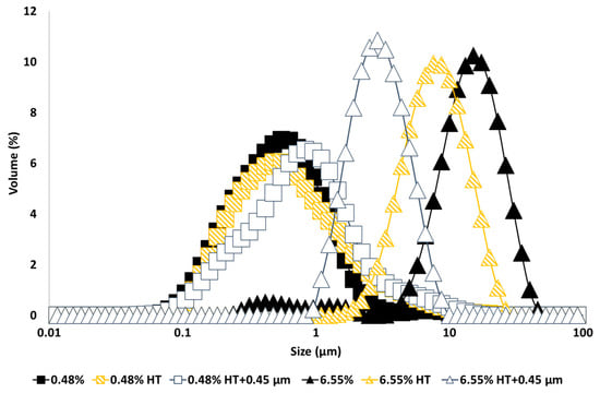 Particle size distribution of 10% oil-in-water emulsions made with unmodified (0.48% and 6.55%), heat-treated (HT), and heat-treated + filtrated (HT + 0.45 μm) GWSC extracts.