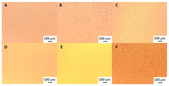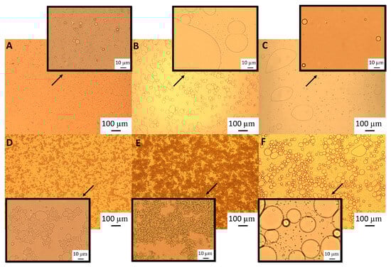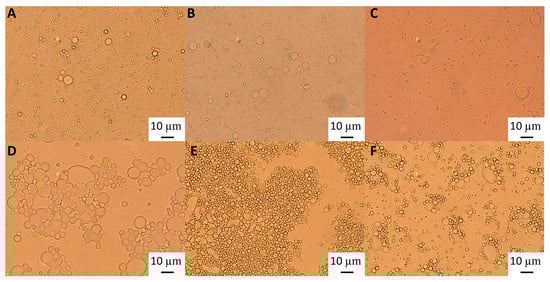 Light microscopy of 10% oil-in-water emulsions made with 0.48% wt/wt GWSC concentration: (A) unmodified, (B) pH treated (pH 2.5), and (C) pH treated + filtrated (pH 2.5 + 0.45 μm), and emulsions made with 6.55% wt/wt GWSC concentration: (D) unmodified, (E) pH treated (pH 2.5), and (F) pH treated + filtrated (pH 2.5 + 0.45 μm).