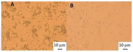 Light microscopy of 10% oil-in-water emulsions of an emulsion stabilised with 6.55% wt/wt GWSC: (A) heat-treated + filtrated (HT + 0.45 μm), and (B) heat-treated + filtrated (HT + 0.45 μm) mixed with 2% SDS solution (1:1 ratio).