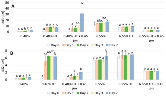 Changes in d43 (A) and d32 (B) over 7 days of storage of 10% oil-in-water emulsions made with unmodified, heat-treated (HT), and heat-treated + filtrated (HT + 0.45 μm) GWSC extracts (0.48% and 6.55% wt/wt). A different statistical analysis was applied for each concentration. Samples within the concentration and treatment groups with the same letter(s) did not present significant differences (p > 0.05).