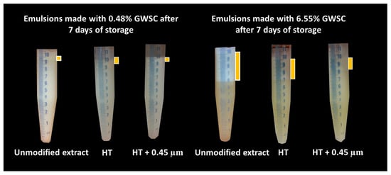 Visual phase separation of the emulsions after one week of storage can be observed in Figure 6, showing the impact of GWSC concentration and its treatment on creaming stability. As expected, enhanced creaming due to bridging and depletion flocculation, together with the greater droplet size occurring at higher GWSC, was observed, as also reported in our previous research [2]. At both low (0.48% wt/wt) and high (6.55% wt/wt) GWSC, the filtration step in the extracts after heat treatment reduced considerably the phase separation in the emulsions, in agreement with the reduction in the extent of flocculation observed in the micrographs (Figure 5). The underpinning reasons for these results were previously discussed in Section 3.1.1.