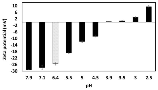 The zeta potential (ζ) of garlic aqueous extract (0.28% GWSC wt/wt concentration) at different pHs. The grey column corresponds to the ζ-potential of the unmodified aqueous extract at native pH.
