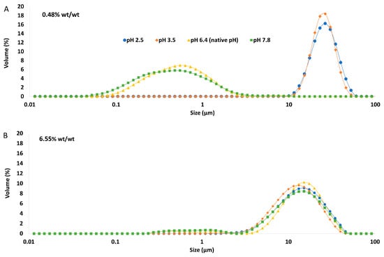 Particle size distribution of 10% oil-in-water emulsions made with pH treated GWSC extracts at (A) 0.48% wt/wt and (B) 6.55% wt/wt.