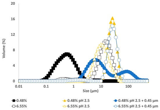 This bimodal distribution is composed of a first peak showing smaller droplet sizes than when only changing the pH from 6.4 to 2.5 and a second peak showing bigger droplets in the 100 µm range, in agreement with the micrographs observed for this emulsion (Figure 9C), where also free oil was detected (non-spherical oil visualised on the left side of the mentioned figure). For the highest concentration (6.55% wt/wt), acidification to pH 2.5 resulted in smaller droplet sizes (d32 = 8.91 µm), whereas the removal of the aggregates after pH adjustment to 2.5 led to greater droplet sizes (d32 = 18.90 µm), as also clearly observed in the micrographs (Figure 9F). It is worthy to note that when measuring droplet size using static light scattering, the samples are diluted in water; therefore, any flocs derived from depletion flocculation are broken; therefore, mainly droplets flocculated via bridging will be detected. Larger individual droplets and clusters of smaller, bridged droplets can generate very similar particle size distributions. This is clearly seen in Figure 9E,F.