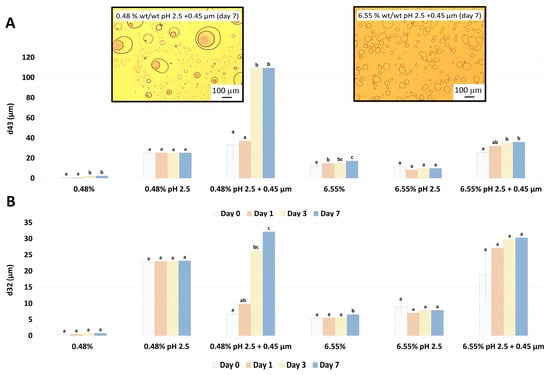 Changes in d43 (A) and d32 (B) over 7 days of storage of 10% oil-in-water emulsions made with unmodified, pH-treated (pH 2.5), and pH-treated + filtrated (pH 2.5 + 0.45 μm) GWSC at two different concentrations. A different statistical analysis was applied for each concentration. Samples within the concentration and treatment groups with the same letter(s) did not present significant differences (p > 0.05).