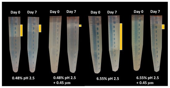 The visual phase separation of these emulsions can be observed in Figure 12. For the lowest GWSC concentration (0.48% wt/wt), strong phase separation was observed after pH modification of the extract (from 6.4 to 2.5). Interestingly, this strong phase separation was not observed after both pH modification and the removal of aggregates from the extract. This is probably affected by both the presence of free oil and the removal of the big aggregates producing droplet aggregation. For the highest GWSC concentration (6.55% wt/wt), phase separation after pH modification or after both pH modification and removal of aggregates from the extract did not occur at day 0; however, was observed after 7 days of storage. On day 7, the same trend as with the lower GWSC concentration was observed, probably having the same underpinning reasons.