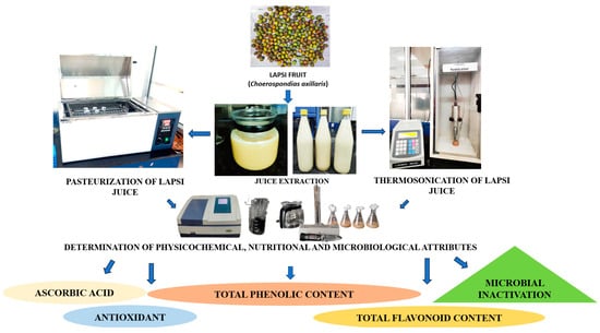 Thermosonication treatments on juice samples were conducted using an ultrasonicator probe (Sonics and Materials, Inc., Newton, CT, USA) at various temperatures (30, 40, and 50 °C) with 750 W full power []. Juice samples (100 mL) were treated at intervals of 15, 30, 45, and 60 min at three different amplitudes (50%, 75%, and 100%) [,]. The sonication was conducted under dark conditions to avoid any interaction with light. After sonication, the juice samples were transferred to sterilised containers and stored at 4 °C until further analysis. The processing of lapsi fruit juice is represented in Figure 1.