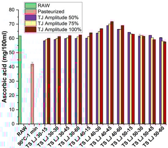 Effects of pasteurisation and thermosonication (TS) (50, 75, and 100% amplitude) on ascorbic acid levels of lapsi juice. Raw, untreated sample; 90-1, pasteurised LJ (lapsi juice); TJ, thermosonicated juice; 30-15, TS LJ at 30 °C for 15 min; 30-30, TS LJ at 30 °C for 30 min; 30-45, TS LJ at 30 °C for 45 min; 30-60, TS LJ at 30 °C for 60 min; 40-15, TS LJ at 40 °C for 15 min; 40-30, TS LJ at 40 °C for 30 min; 40-45, TS LJ at 40 °C for 45 min; 40-60, TS LJ at 40 °C for 60 min; 50-15, TS LJ at 50 °C for 15 min; 50-30, TS LJ at 50 °C for 30 min; 50-45, TS LJ at 50 °C for 45 min; 50-60, TS LJ at 50 °C for 60 min.
